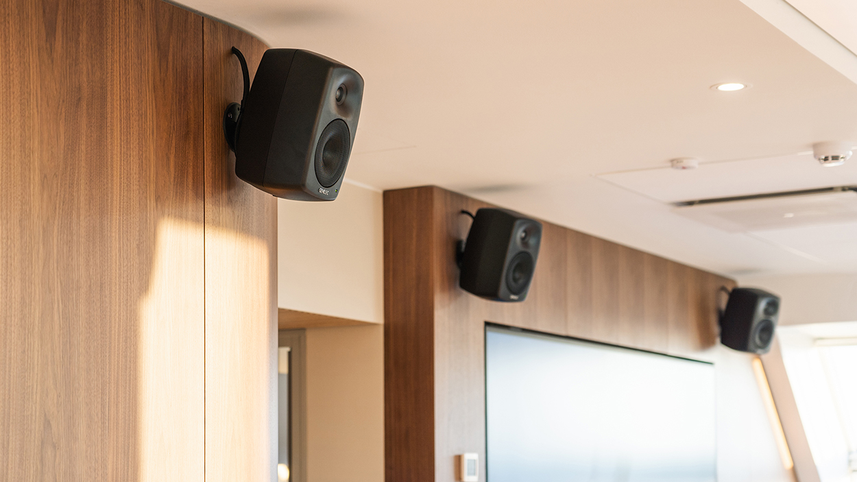 高解像度のビデオ会議は、現在ではどの企業の役員室でも標準的なものになっています。壁や天井に取り付けられたGenelecのスピーカーを使用すれば、スクリーンや上からスピーチの音声を補強することができ、室内にいるすべての参加者にビジネス・メッセージが確実に行き渡ります。
